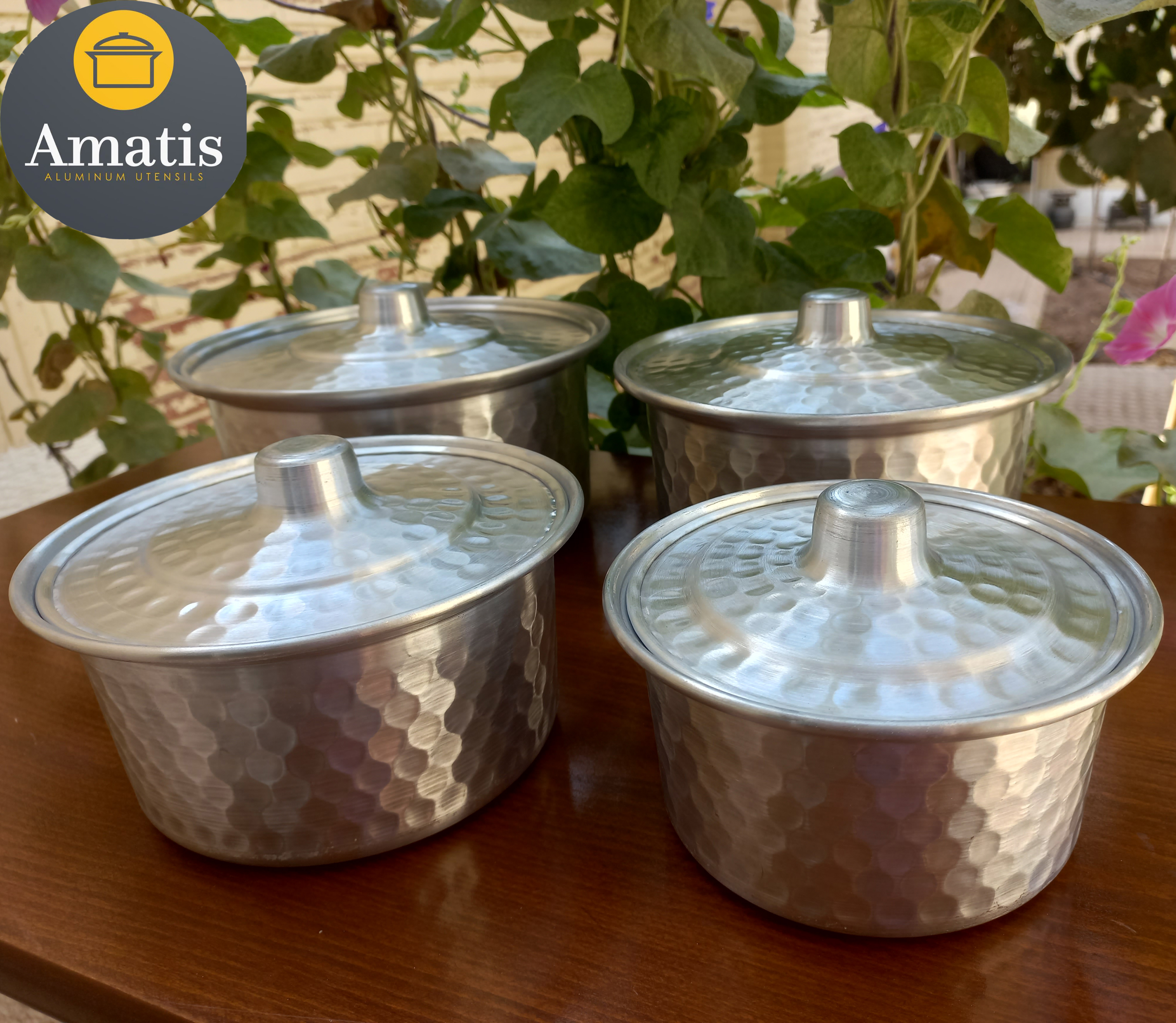 🔸 قابلمه آلومینیومی ، با کیفیت درجه 1،، 4 عدد با قطر های 14، 16، 18، 20برابر با 1 پیمانه برنج، 1،5 تا 2 پیمانه، 2 تا 2،5 پیمانه، و 2،5 تا 3 پیمانه برنج با احتساب چند سانت فضای خالی از سر قابلمه